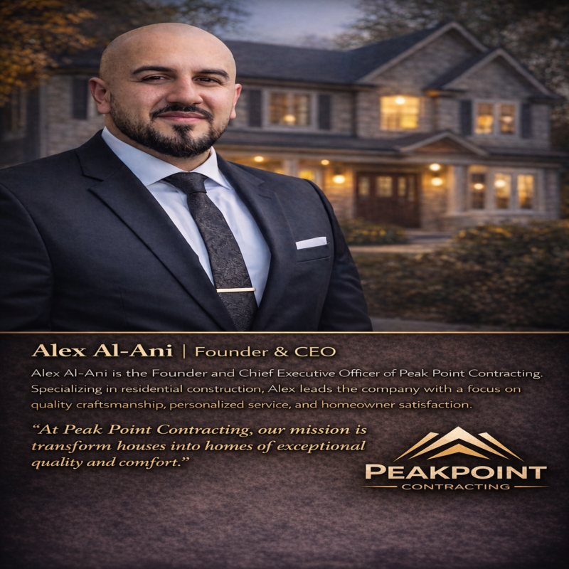 Alex Al-Ani is the Founder and Chief Executive Officer of Peak Point Contracting. Specializing in residential construction, Alex leads the company with a focus on quality craftsmanship, personalized service, and homeowner satisfaction. "At Peak Point Contracting, our mission is transform houses into homes of exceptional quality and comfort."