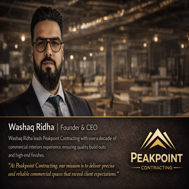 Washaq Ridha leads Peakpoint Contracting with over a decade of commercial interiors experience, ensuring quality build-outs and high-end finishes. "At Peakpoint Contracting, our mission is to deliver precise and reliable commercial spaces that exceed client expectations."